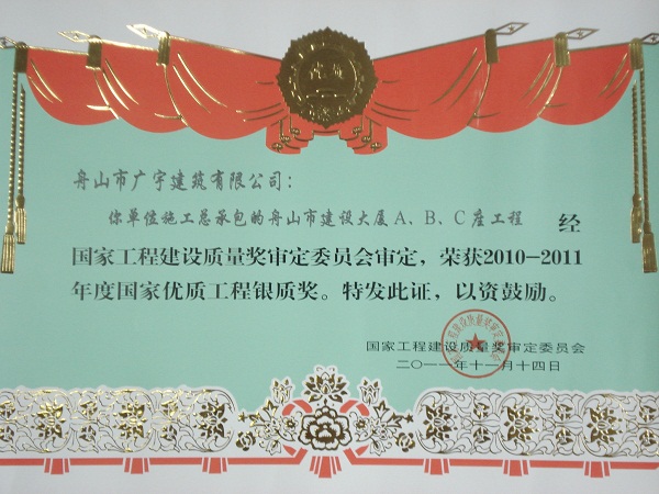 2010-2011年度國家優(yōu)質工程獎銀質獎(舟山建設大廈C座)